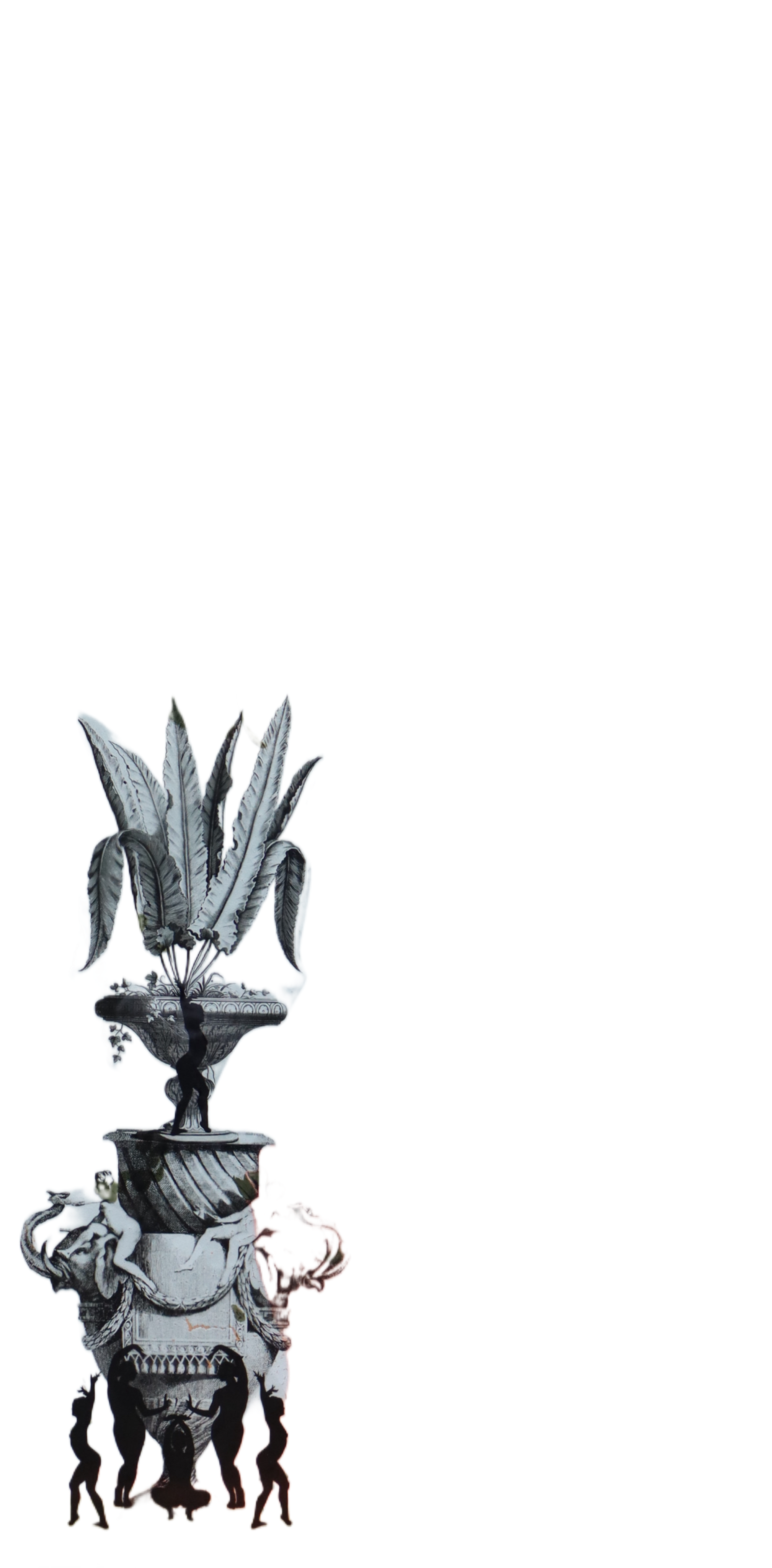 The Elephant’s Promise, 48x24x4inc, mix media, resin coated. From the series When Chaos Meets Order, this painting presents a contemporary totem an ornamental composition connecting past, present, and future. The classical urn symbolizes heritage and tradition; the living plant embodies the present moment and natural vitality; and the elephant, its trunk raised upward, carries a wish for future growth, prosperity, and good fortune.